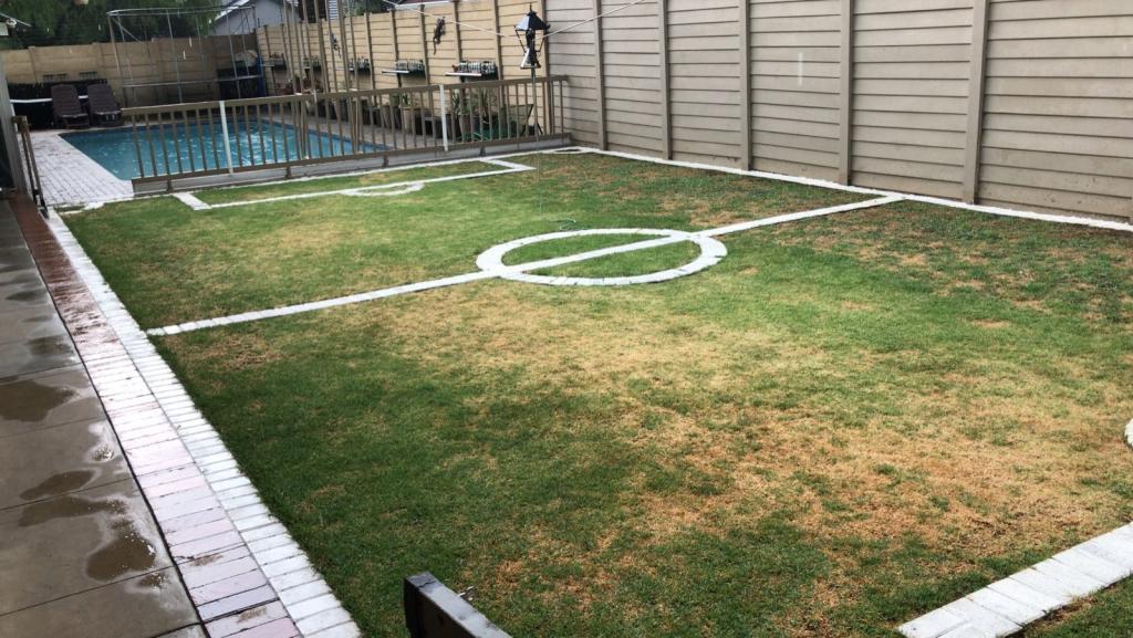 Sparkling pool. Tennis court or soccer field, and the enclosed entertaining area with a bar.